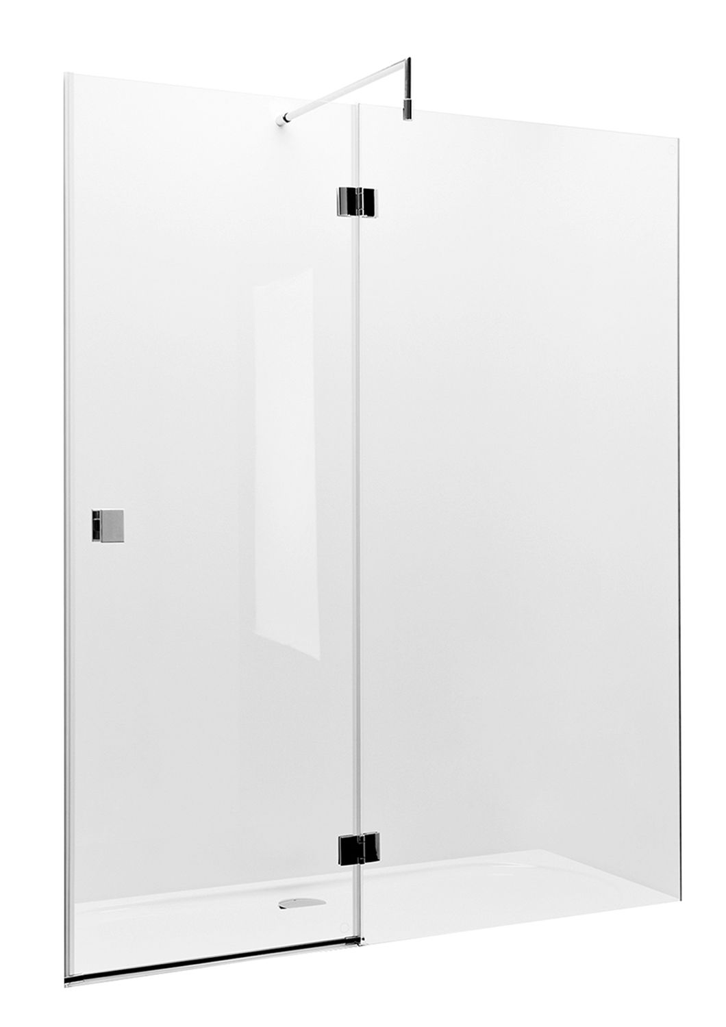 Прозрачное закаленное стекло толщиной 8 мм с гидрофобным покрытием MaxiClean. Хромированные алюминиевые профили, хромированные латунные петли и ручки. Возможен монтаж без душевого поддона.