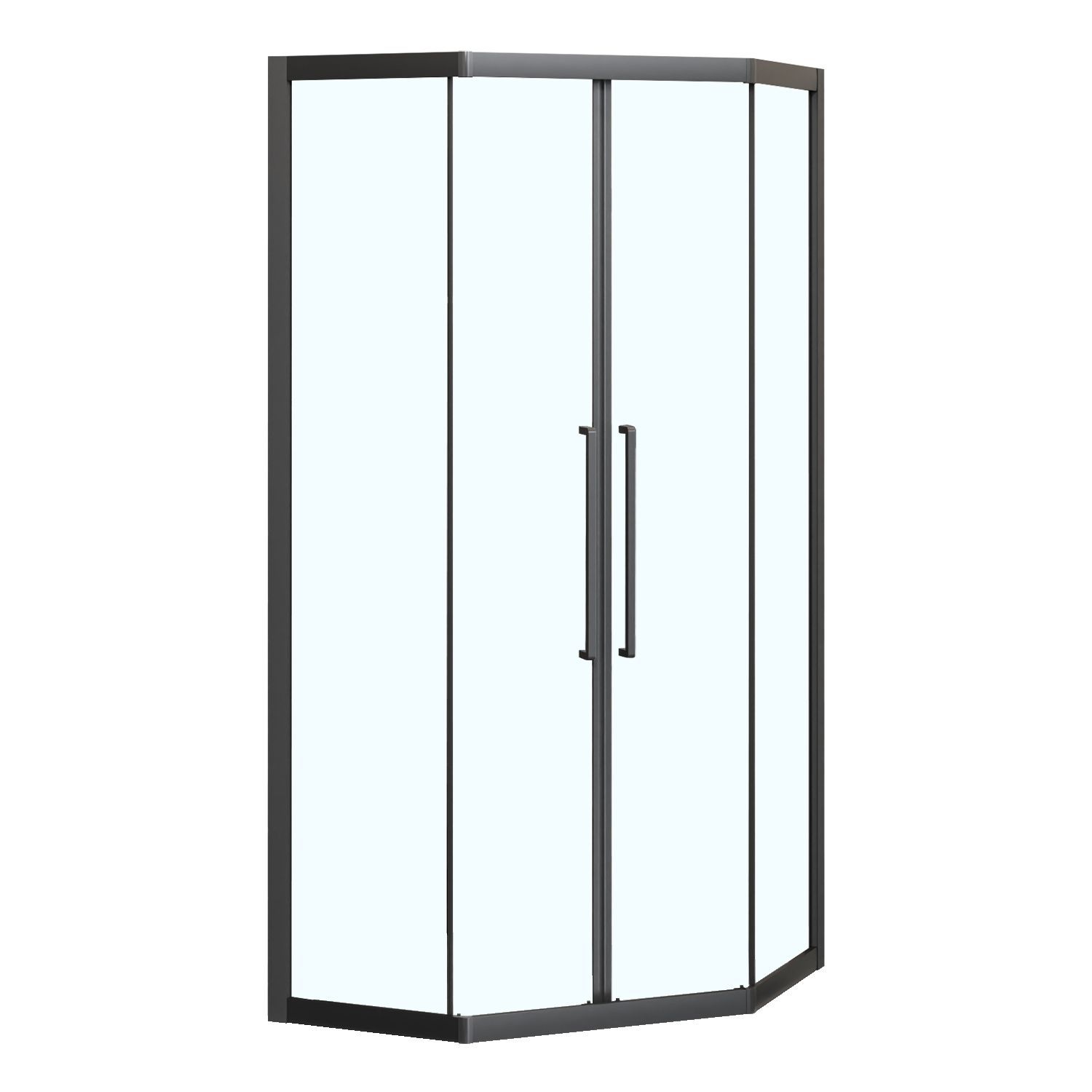 Пятиугольный душевой уголок, с двумя раздвижными дверьми, на усиленных двойных роликах с нержавеющими подшипниками.