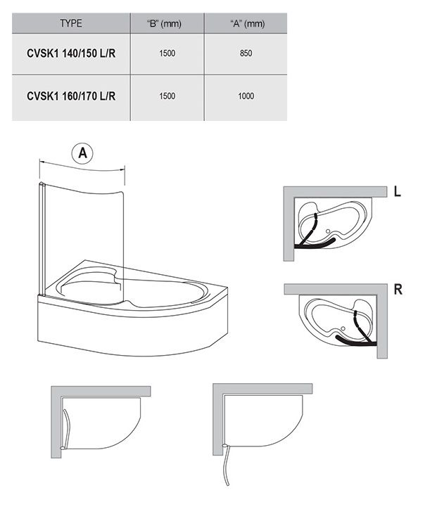 размеры: 85 см для ванн 140, 150 см; 100 см для ванн 160, 170 cм