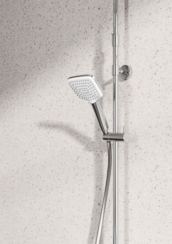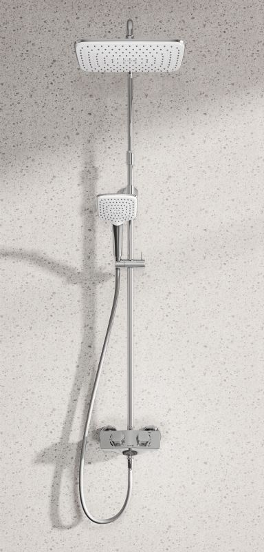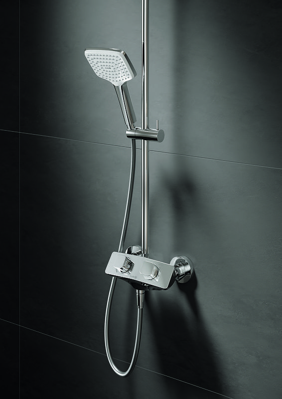 В комплекте поставки: смеситель, верхний душ, душевая лейка, душевой шланг, душевая штанга с держателем лейки, комплект креплений.