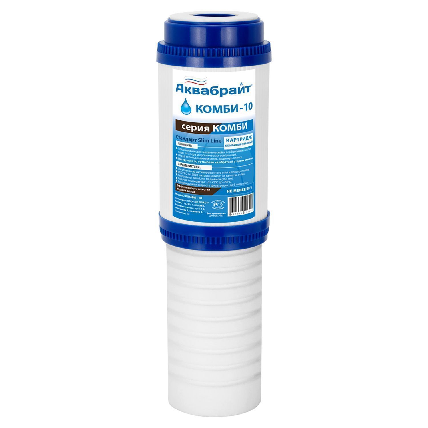 КОМБИ-10, Комбинированный картридж АКВАБРАЙТ для механической и сорбционной очистки воды от грязи, песка, хлора и органических соединений, Типоразмер SLIMLINE 10 дюймов. Улучшает органолептические показатели воды (вкус, запах и цвет). Ресурс до 3000 литров.