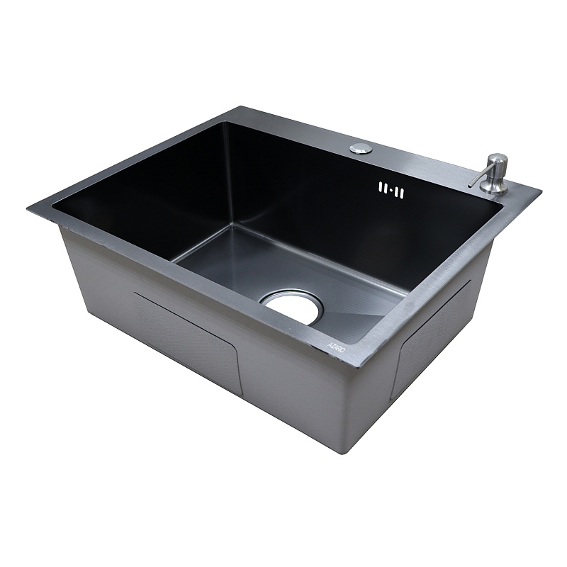 —Кухонная мойка AZARIO NICOLE 500х500х220 нержавеющая сталь, в комплекте сифон, диспенсер, коландер, черная соты (AZB5050H)