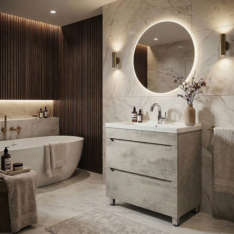 Комплект тумбы Florena 80 с раковиной MONTE Neo 80 — это готовое решение для ванной комнаты, выполненное в современном стиле и актуальном оттенке «Светлый бетон». Гарнитур идеально подходит для помещений, где ценится лаконичный дизайн и практичность.