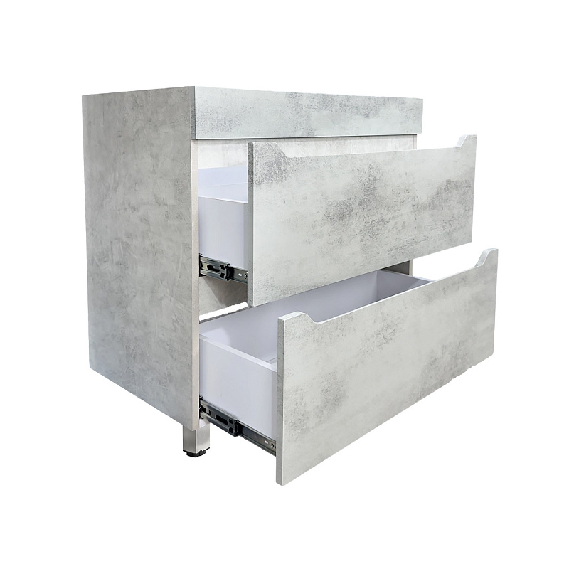 Напольная тумба (размеры 810х810х470 мм) изготовлена из высококачественного МДФ. Матовое покрытие фасада не только приятно на ощупь, но и устойчиво к влаге и перепадам температур, сохраняя безупречный внешний вид на долгие годы. Цвет «светлый бетон» привносит в интерьер нотки индустриальной эстетики и визуально расширяет пространство.