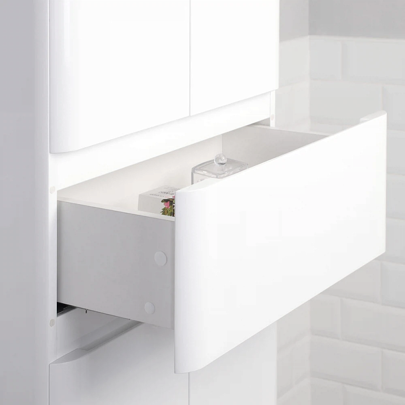 Идеальный белый глянец в сочетании с современным лаконичным дизайном-это коллекция Roberto.Эстетика изящества и минимализма-скругленные фасады,отсутствие лицевой фурнитуры.Напольный пенал выполнен из влагозащищенного МДФ, покрыт белоснежной глянцевой эмалью.Качественные петли с доводчиками и направляющие скрытого монтажа обеспечат плавное выдвижение ящичка,бесшумное закрывание дверок.Вместительные полки позволят разместить бытовую химию,а так же средства личной гигиены.Мебель способна вместить в себя достаточно много вещей.Изысканность,простота и гармоничность-все сошлось в этой прекрасной коллекции!