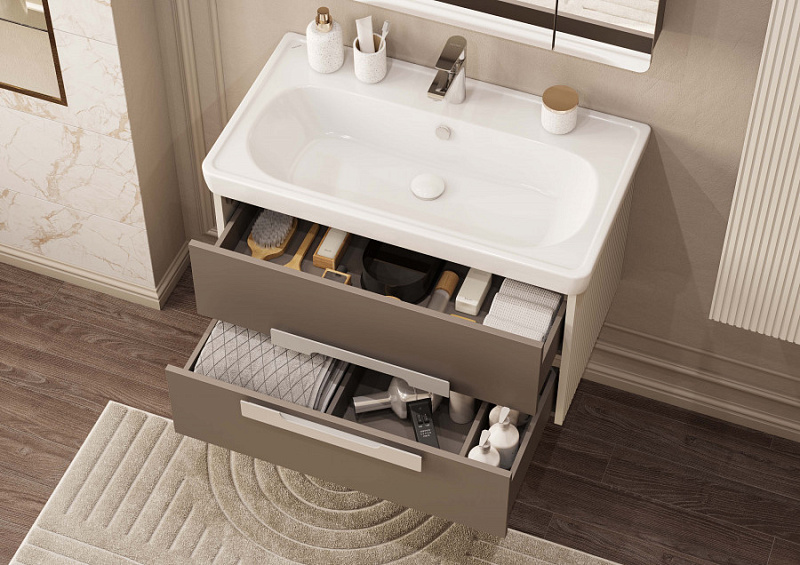 Коллекция мебели Ар-Деко воплощает изящество и элегантность этого уникального направления. Каждая деталь коллекции от массивных хромированных ручек до фрезерованных панелей - продумана до мелочей. Тумба под раковину выполнена из высококачественной МДФ, покрытой матовой пленкой. Вертикальная фрезеровка на боковинах создает эффект визуального увеличения высоты изделия, придавая ему элегантность и изящество. В тумбе есть два вместительных ящика с эргономичной организацией пространства, которую можно настроить по своему удобству. Ящики открываются при помощи удобной ручки, а благодаря направляющим с доводчиками обеспечивается плавное закрывание, что гарантирует бесшумность и комфорт использования мебели. Данная тумба комплектуется раковиной Santek Нео Классик.