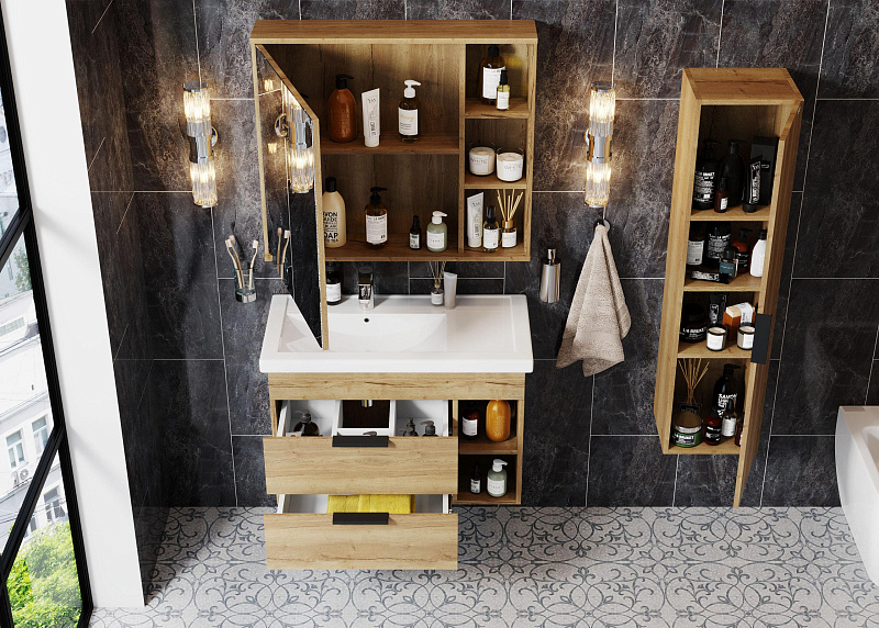 Подвесная тумба Onika ЛЕГРАН 80.13 - это сочетание насыщенного древесного декора и благородства металла: роскошная текстура и натуральный цвет дуба дают теплоту, а матовые металлические ручки добавляют урбанизма и солидности.