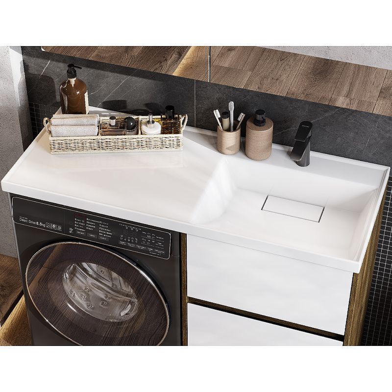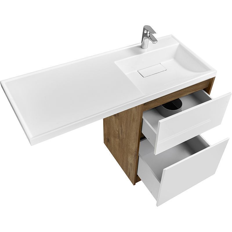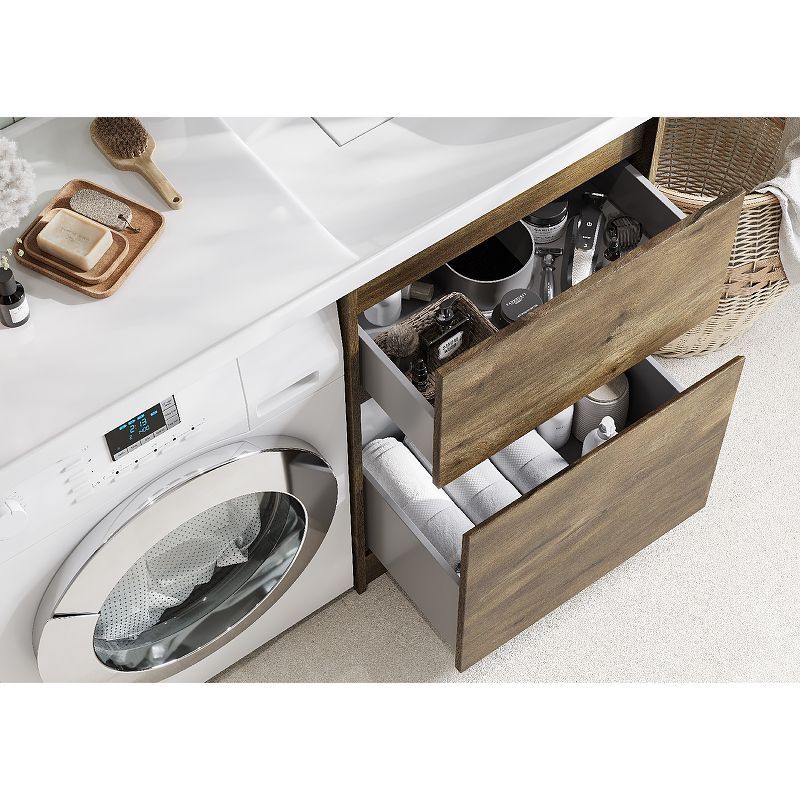 Тумба Лондри под стиральную машину выполнена из влагостойкой ламинированной плиты в древесной отделке. Корпус тумбы и фасад приобретаются отдельно. Тумбы комплектуются фасадами как с такой же древесной текстурой, так и в универсальном белом глянцевом цвете – это позволяет выбрать модель тумбы в соответствии с личными предпочтениями, создав наиболее удачное решение для конкретного интерьера ванной комнаты. Верхний ящик открывается с помощью системы push-to-open, а нижний - за фасад с помощью удобного выпила под углом. Ящики выдерживают нагрузку до 25 кг. Тумба установлена на регулируемые опоры, которые находятся за цоколем. Тумба комплектуется раковиной Лондри 120 из прочного литого мрамора, который устойчив к воздействию химических средств. Широкое крыло раковины обеспечивает ванную комнату дополнительным функциональным пространством. Дополнительно к тумбе можно приобрести шкаф-колонну Лондри и зеркальный шкаф Лондри 120.