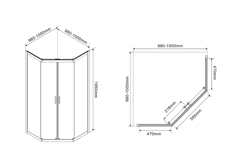 Пятиугольный душевой уголок, с двумя раздвижными дверьми, на усиленных двойных роликах с нержавеющими подшипниками.