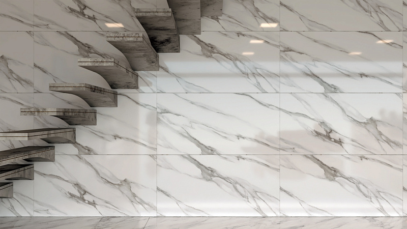 Нежный, нейтральный и умеренно строгий светлый керамогранит Venezia White с богатым рисунком из хаотичной сетки прожилок серого оттенка.