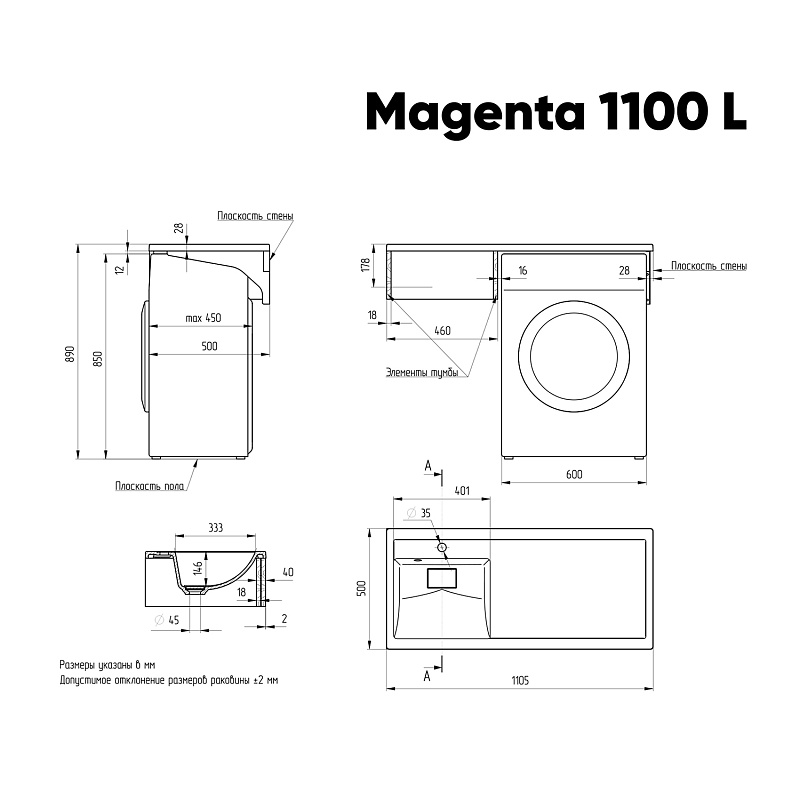 Раковина-столешница универсальная Paola Magenta 1100 L (левая чаша) для подвесной установки над стиральной машиной и частично на тумбу. Современная, стильная, эргономичная, позволяет экономить площадь ванной комнаты, так как под столешницу прекрасно впишется стиральная машина. Также возможен монтаж раковины полностью на тумбу вровень. Раковина выполнена из прочного износостойкого литьевого мрамора, сверху покрыта специальным защитным покрытием гелькоутом. Исполнение поверхности Glossy Shine - изделие обладает глянцевым блеском, очень приятное на ощупь, прочное. Даже при минимальном уходе долго сохраняет безупречный цвет и внешний вид. В комплекте - правый кронштейн с крепежом, выпуск и декоративный элемент, под которой спрятан слив,  технический паспорт и гарантийный талон. Заводская гарантия составляет 5 лет, срок службы более 10
