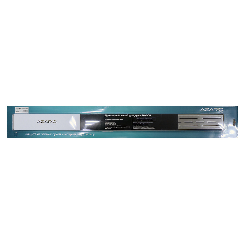 Душевой желоб AZARIO  900 мм сухой/мокрый гидрозатвор с горизонтальным выходом D40 (переходник D50), поворотным сифоном из ABS пластика и  решеткой - идеальное решение для эффективного сбора, и отведения жидкости в канализацию с поверхности пола. Они предназначены для монтажа в ванных комнатах, душевых, санузлах квартир, загородных домов и общественных местах.