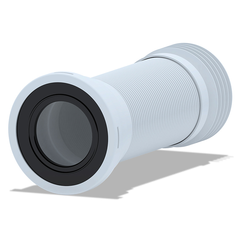 Длина трубы 250-550мм, присоединение к унитазу через резиновую муфту, выход на канализацию 100-110 мм. Для чугунных труб канализации. Удлинители гибкие выполняют функцию фановых труб и предназначены для соединения унитаза с канализационной трубой. Основное преимущество в том, что они легко монтируются и нет необходимости заранее замерять угол и расстояние (как в случае с фановыми трубами). Гофрированная часть трубы армирована металлической проволокой, что значительно повышает прочность и износостойкость изделия.