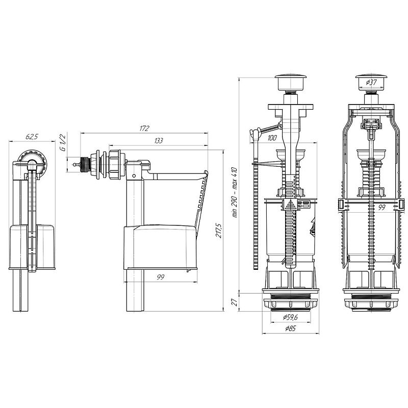 Наливной механизм с боковой подводкой и пластиковой резьбой диаметром G 1/2