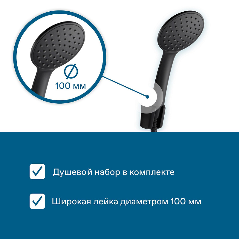 - душевой набор в комплекте: лейка ø100 мм; шланг 1.5 м, настенный держатель;