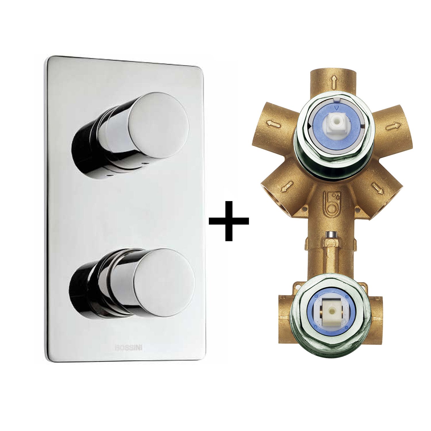 —Комплект Bossini CUBE Смеситель для душа, встраиваемый, внешняя часть, хром + Универсальная встроенная часть для механического смесителя на 2-5 источников (Z00004.030+Z00130)