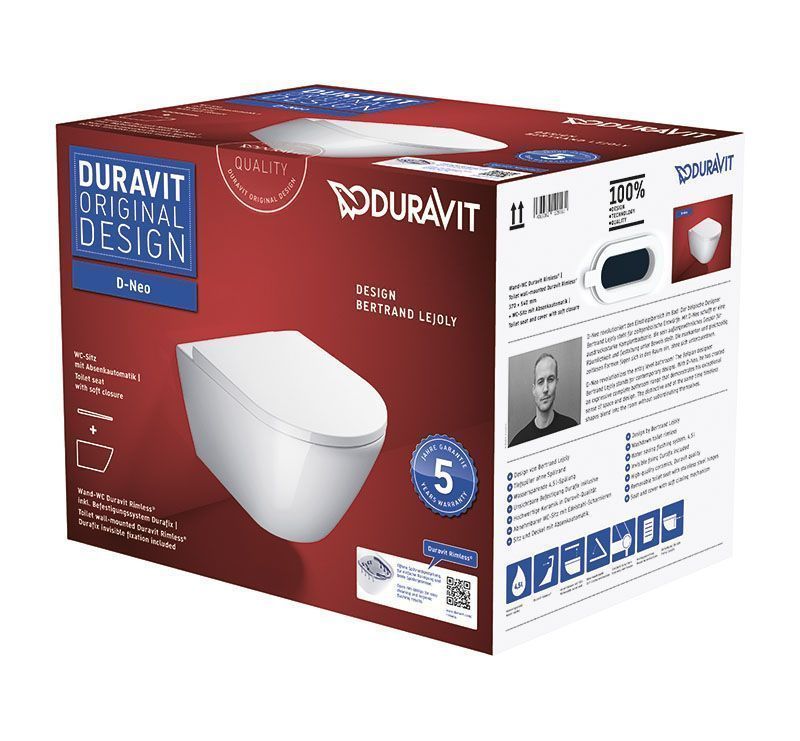 —Унитаз подвесной Duravit D-Neo Rimless с креплением Durafix, сиденье микролифт, белый (45770900A1)