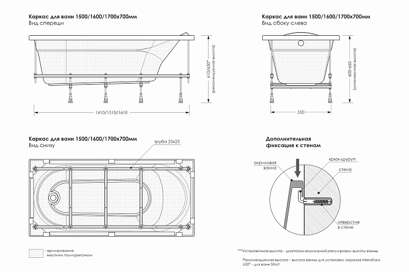 Сборно-разборный металлический каркас для ванны 1600х700 мм.